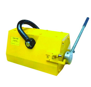 YX系列永磁起重吸盘采用钕铁硼高能永久磁性材料,在磁路中产生很强的吸持力,其借助手柄转动极芯轴使起重器处于工作或关闭状态,无需外界供电。当起重器处于工作状态时,起重器底部的吸持面构成一对纵向磁极,将导磁性材料的工件牢固地吸持,吸持面上还有V字槽,因此既可吸持板块状工件,又可吸持圆柱形工件。